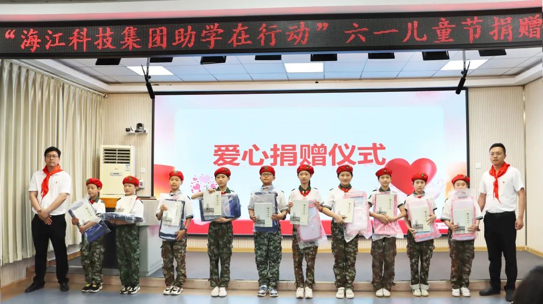 ? ? Supported by the Cangzhou Yunhe District Education Bureau and Cangzhou County Education Bureau, the Party Branch of Haijiang Group visited eight schools, including Huanghe Road Primary School, Guangming Road Primary School, Wangjiapu Primary School, Wanghai Temple Primary School, Cangzhou No. 17 Middle School, Cangzhou County?No. 3 Middle School, Cangzhou Fenghuadian Middle School and Fenghuadian High School, and carried out the donation ceremony of "Haijiang Science and Technology Group in Supporting Education" on the occasion of June 1 Children's Day.?