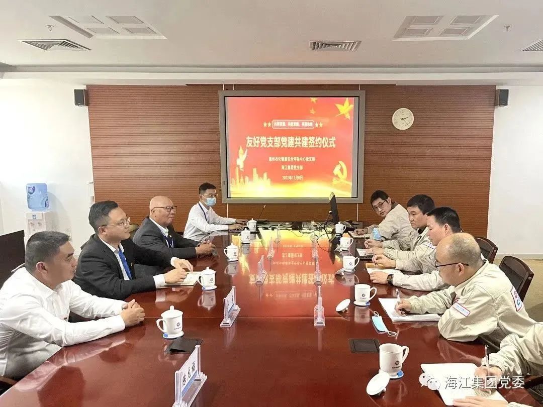 On December 8, the party branch of Haijiang Group and the party branch of Huizhou Petrochemical HSE Center held a party-building sharing activity.?Li Jiangshan, secretary of the party branch of CNOOC Huizhou Petrochemical HSE Center,?Liu Chong, discipline member of the party branch,?Chen Zijian, youth member of the party branch, and?Lv Di, publicity member of the party branch, attended the activity together with?Gao Qiying, secretary of the party branch of Haijiang Group,?Ye Jun, deputy general manager,?Zhu Weidong, director of the safety and environmental department and other party members.